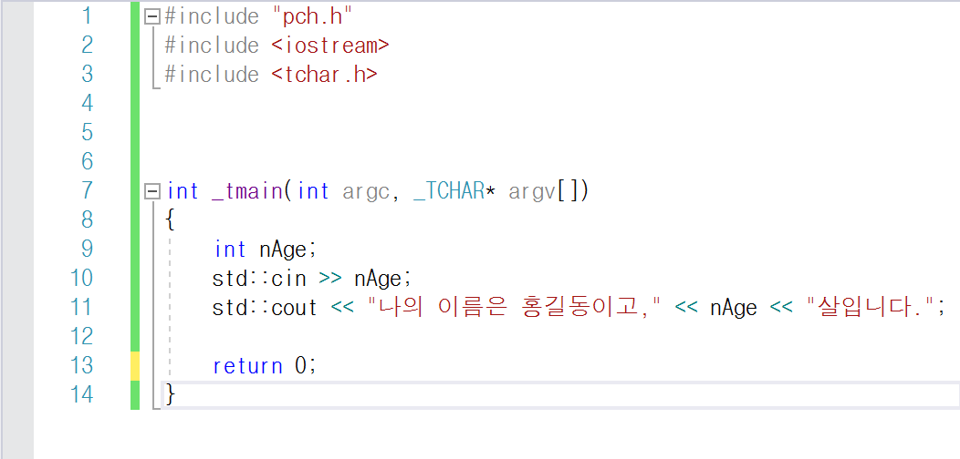 std::cout << "나의 이름은 홍길동이고," << nAge << "살입니다.";